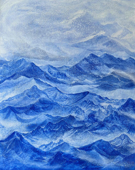 작품 속의 형상은 종종 산과 바다로 나타나지만, 그것은 단지 지형의 재현이 아닌, 보이지 않는 힘들과의 내밀한 연결성을 상징한다.